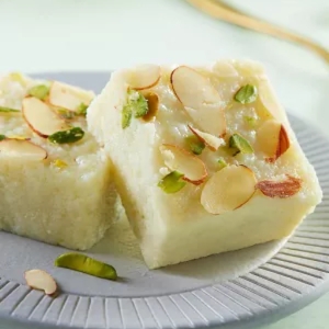 Malai Barfi is a luxurious milk-based sweet made by simmering malai (cream) and khoya to a thick consistency, then setting it into rich, creamy slabs.